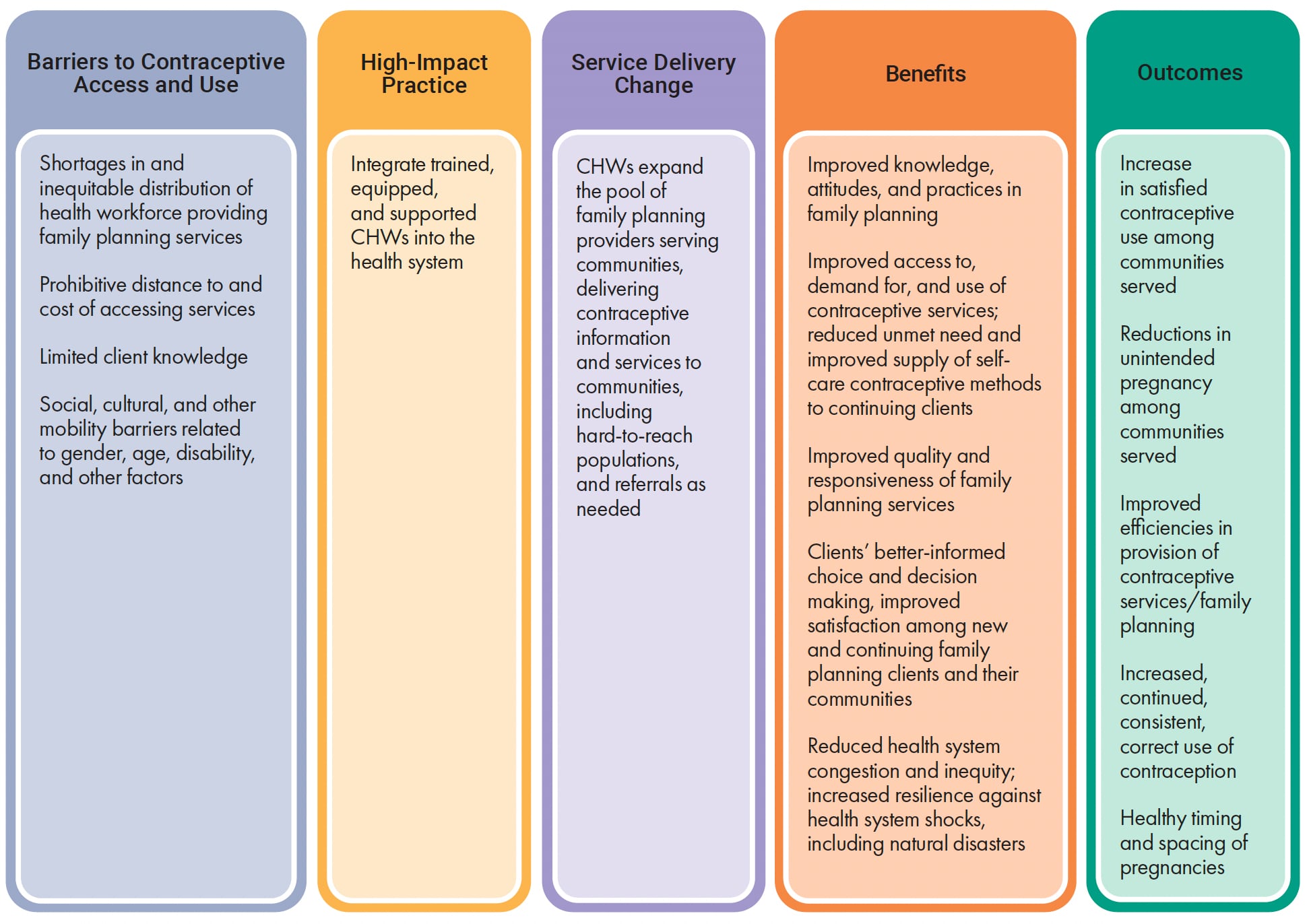 CHWs working in coordination with a functioning health system reduce unmet need for contraception and help couples and individuals accomplish their reproductive intentions.
