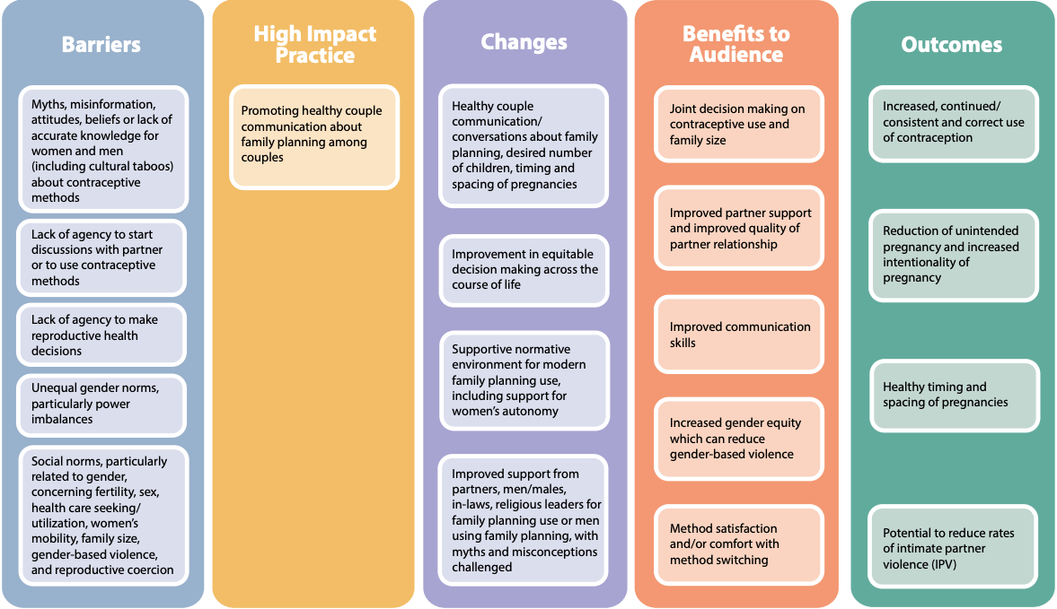 High Impact Practices in Family Planning (HIP). Promoting healthy couples’ communication to improve reproductive health outcomes. Washington, DC: USAID; 2022 Apr. Available from: https://staging.fphighimpactpractices.org/