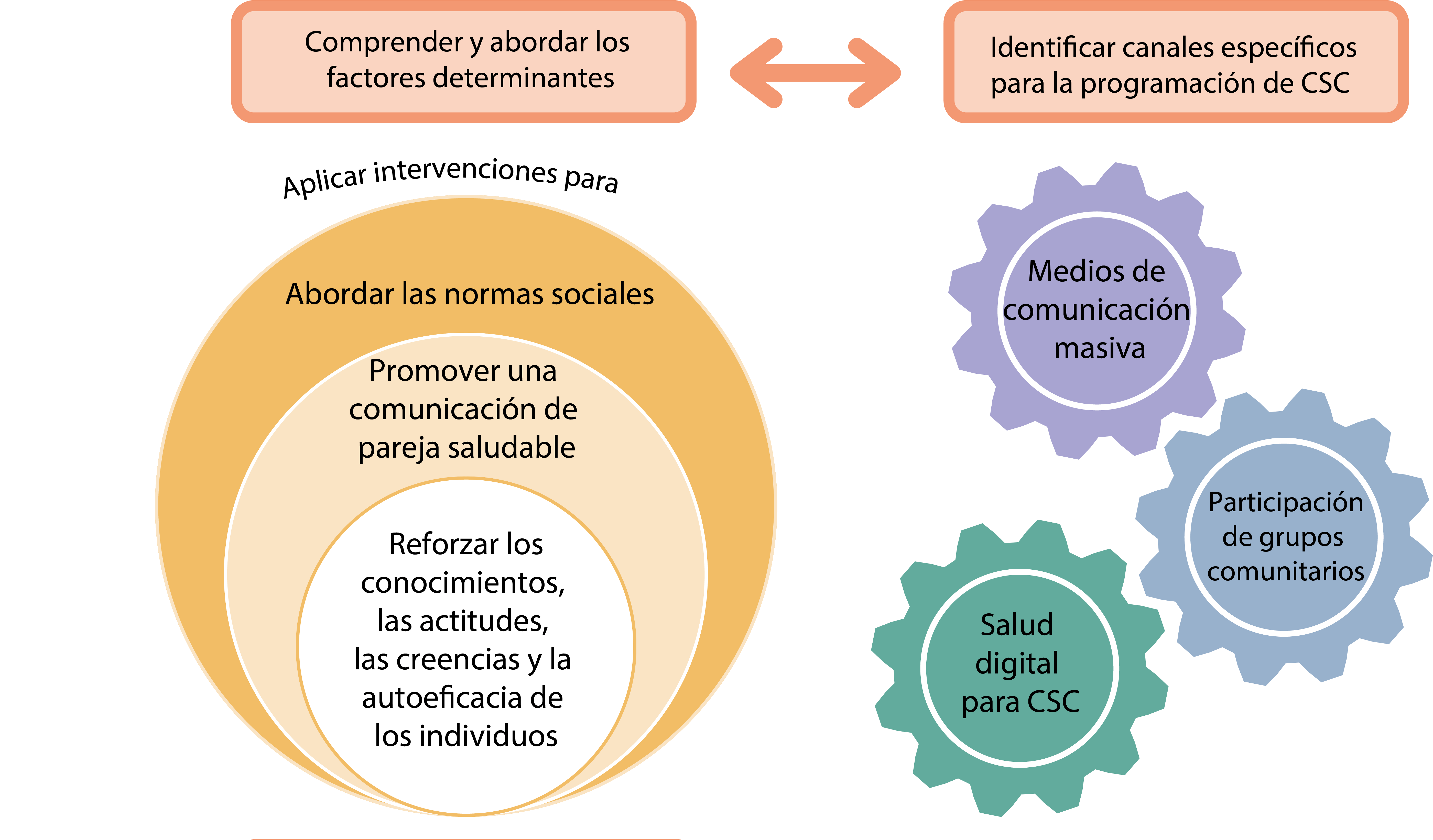 Las intervenciones de CSC que pretenden abordar los determinantes del comportamiento pueden emplear una serie de canales de comunicación y otros enfoques de intervención. Actualmente hay tres reseñas PAI que se refieren a canales de comunicación específicos para los CSC: medios de comunicación de masas, participación de grupos comunitarios (PGC) y tecnologías digitales. También pueden tomarse en cuenta otros enfoques de los CSC.