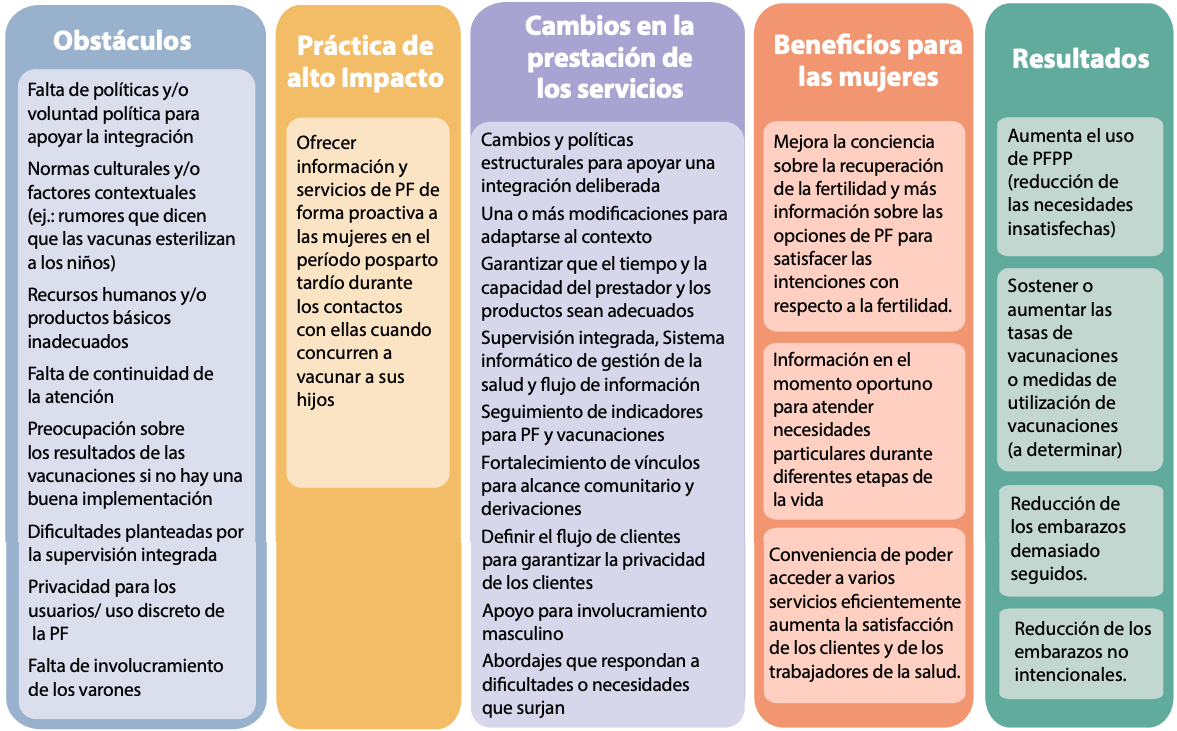 Prácticas de alto impacto en la planificación familiar (PAI). Integración de la planificación familiar y los servicios de vacunación: Llegar a las mujeres con servicios de planificación familiar después del parto. Washington, DC: USAID; 2021 Jul. Disponible en: https://staging.fphighimpactpractices.org/briefs/family-planning-and-immunization-integration/