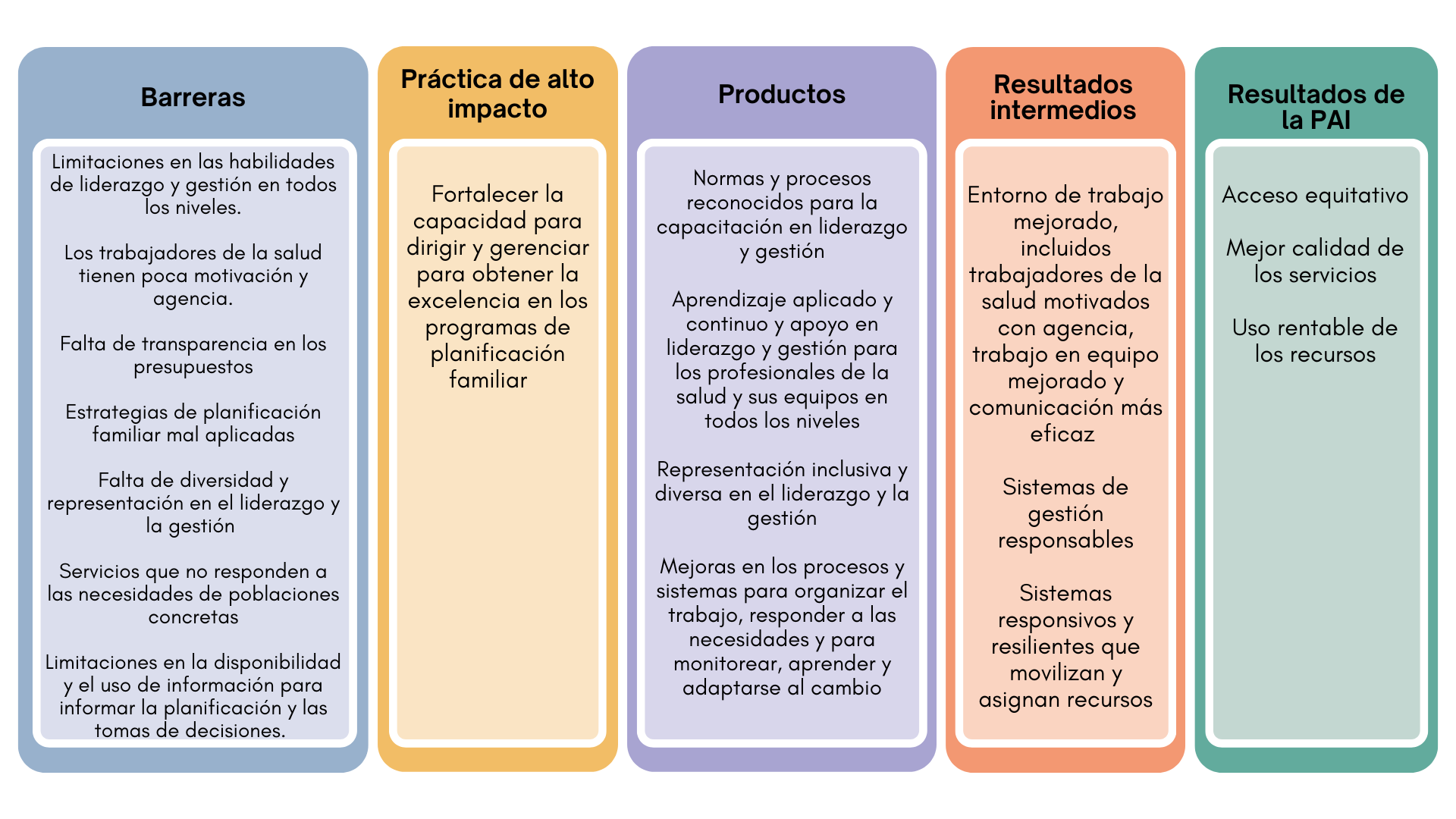 Ésta es una de las varias “prácticas de alto impacto” (PAI) en planificación familiar identificadas por la Asociación HIP y examinada por el Grupo de Asesoramiento Técnico de las PAI.14 El fortalecimiento de la capacidad de liderazgo y gestión es fundamental para el desempeño de otras intervenciones programáticas de PAI y de planificación familiar. Por lo tanto, cuando se implementa cualquiera de estas prácticas, es preciso integrar el liderazgo y la gestión a fin de aprovechar todo su potencial. Para más información sobre otras PAI, véase https://staging.fphighimpactpractices.org/es.