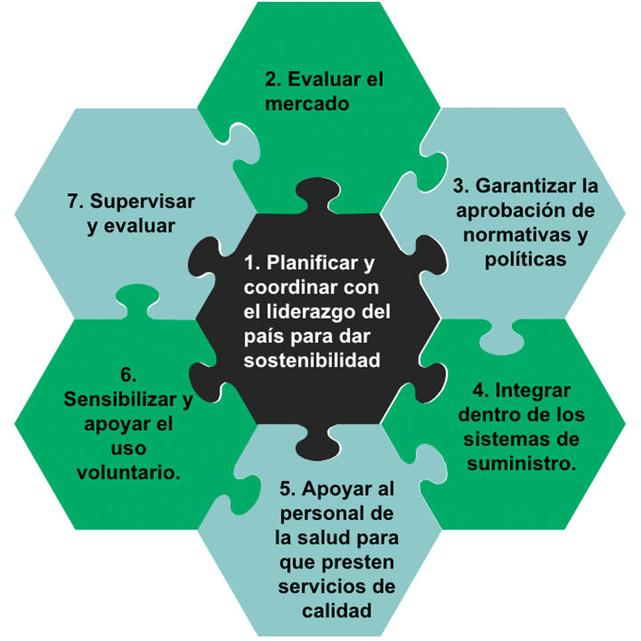 Esta Guía de Planificación Estratégica tiene por objeto guiar a los gerentes de programas, planificadores, encargados de formular políticas nacionales y otras partes interesadas a través de un proceso estratégico para coordinar la introducción de métodos anticonceptivos a través de canales de acceso públicos y privados. La guía fue desarrollada a través de consultas con expertos técnicos y resume una orientación de recursos clave para la introducción de métodos. A su vez, ofrece una visión general asi como enlaces a otros recursos que permiten profundizar y obtener más detalles. Los esfuerzos exitosos de introducción de anticonceptivos suelen incluir los siete elementos de la figura 1. Estos elementos no son enumerados como pasos lineales porque el proceso suele ser iterativo; a menudo es necesario revisar y adaptar los enfoques para sentar las bases para una expansión.