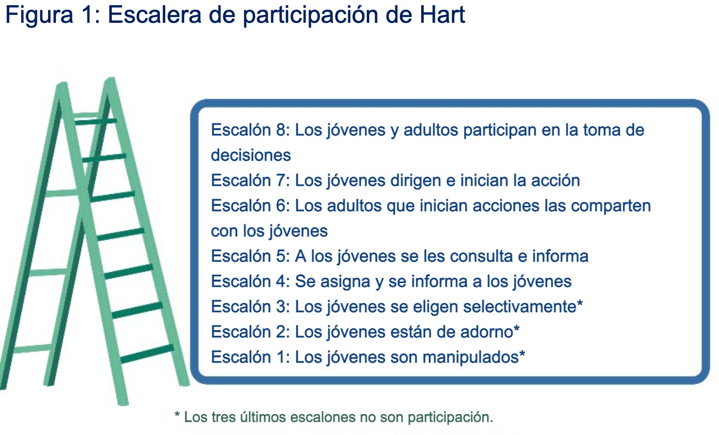 Como se ilustra en la Escalera de la Participación de Hart (Figura 1),4 la participación de los jóvenes puede ir desde su ausencia en la participación hasta el verdadero compromiso de los jóvenes o una alianza con ellos. Esta guía se centra en los peldaños 4-8 de la escalera. La «participación de los jóvenes» se refiere a los peldaños 4-6 y la «alianza de los jóvenes» se refiere a los peldaños 7-8, cuando los jóvenes tienen funciones de liderazgo y poder, y la toma de decisiones se comparte por igual con los no jóvenes.2