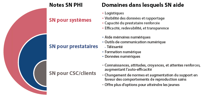 Des six éléments constitutifs des systèmes de santé identifiés par l’OMS,3 cette note se focalise sur le premier : la prestation de services. Plus précisément, l’accent est mis sur la manière dont la santé numérique peut aider les prestataires de services à fournir des services de contraception de qualité. Dans le contexte du cadre plus récent du système de santé de haute qualité, cette note sefocalise sur deux aspects du cadre : des soins et des systèmes compétents (élément du processus de soins) et la main-d’œuvre (élément de base)4. La note se focalise spécifiquement sur les prestataires parce que d’autres notes sur les Pratiques à Hauts Impacst (PHI) traitent des technologies numériques pour les clients et des technologies numériques pour renforcer le système de santé. La figure 1 résume le contenu inclus dans les trois notes de PHI sur la santé numérique.