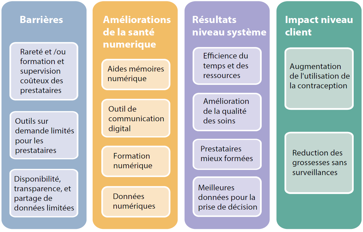 Les outils de santé numériques peuvent aider les prestataires de PF à fournir des soins de meilleure qualité grâce à des mémoires, des outils de communication, de la formation et des données. La théorie du changement (figure 2) montre les résultats au niveau des systèmes et les impacts au niveau des clients lorsque les fournisseurs utilisent des outils de santé numériques pour surmonter les obstacles à la qualité du service.