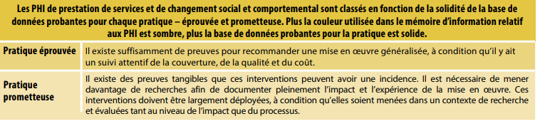Les PHI sont identifiées selon l’ampleur de l’impact sur l’utilisation de contraceptifs et l’application potentielle dans divers contextes. Les mesures des résultats sont également prises en compte, notamment les grossesses non désirées, la fertilité ou un des déterminants connexes primaires de la fertilité (retardement du mariage, espacement des naissances ou allaitement). Les preuves de réplicabilité, d’évolutivité, de durabilité et de rentabilité sont également prises en compte.