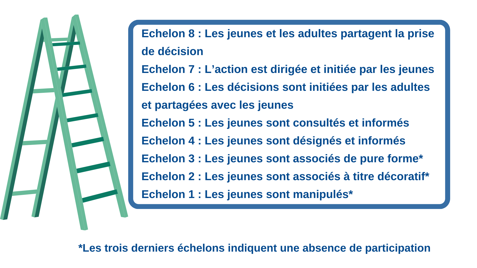 Comme l’illustre l’Échelle de participation de Hart (Figure 1),4 la participation des jeunes peut aller de l’absence de participation à un véritable engagement ou partenariat des jeunes. Ce guide se concentre sur les échelons 4 à 8 de l’échelle. L’« Engagement des jeunes » fait référence aux échelons 4 à 6 et le « Partenariat des jeunes » fait référence aux échelons 7 à 8, lorsque les jeunes se voient accorder des rôles de leadership et du pouvoir, et que la prise de décision est également partagée avec les non-jeunes.2