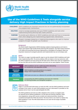Audience and Use: The tool is intended to be a quick reference for program managers designing or implementing family planning programs. The tool can be used to help improve implementation of HIPs by illustrating how to incorporate WHO evidence-based guidelines and/or can be used to support advocacy efforts for HIPs by linking them with globally recognized and credible WHO Guidelines.