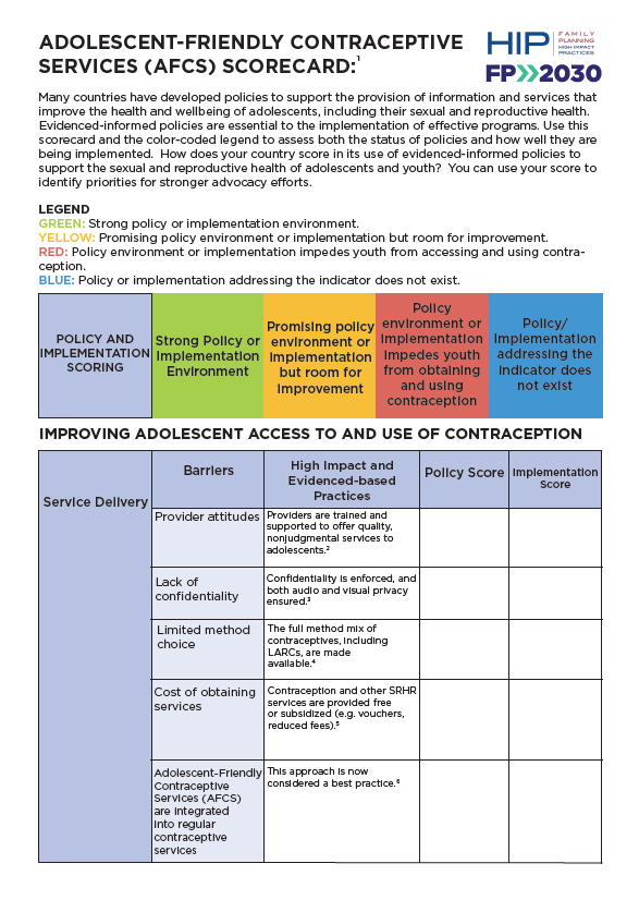 Adolescent-Friendly Contraceptive Services (AFCS) Scorecard