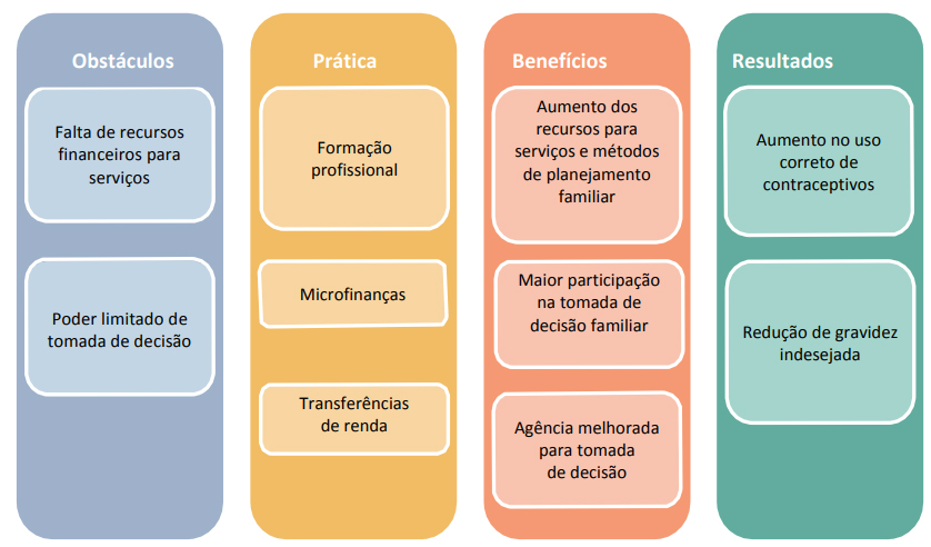 O empoderamento econômico é a capacidade de tomar decisões que envolvam o controle e a alocação de recursos financeiros e de agir sobre elas (Golla et al., 2011). A influência das mulheres sobre as decisões financeiras está associada ao aumento no uso de serviços de saúde preventiva por crianças e mulheres (Lagarde et al., 2009; Ahmed et al., 2010), incluindo o uso de métodos contraceptivos modernos (Ahmed et al., 2010; E Kurimoco, 2012). Assim, as intervenções que visam aumentar o poder econômico de mulheres e meninas podem melhorar comportamentos de saúde reprodutiva, incluindo o uso prolongado de contracepção moderna (ver Figura 1), particularmente quando ligado a investimentos que lidam diretamente com a saúde reprodutiva e o planejamento familiar e/ou as normas de gênero. O exemplo de teoria da mudança na Figura 1 apresenta os obstáculos que podem ser abordados diretamente por meio de intervenções de empoderamento econômico. Embora a teoria da mudança esteja organizada em um formato linear, os mecanismos da ação são provavelmente bidirecionais e mais complexos.
