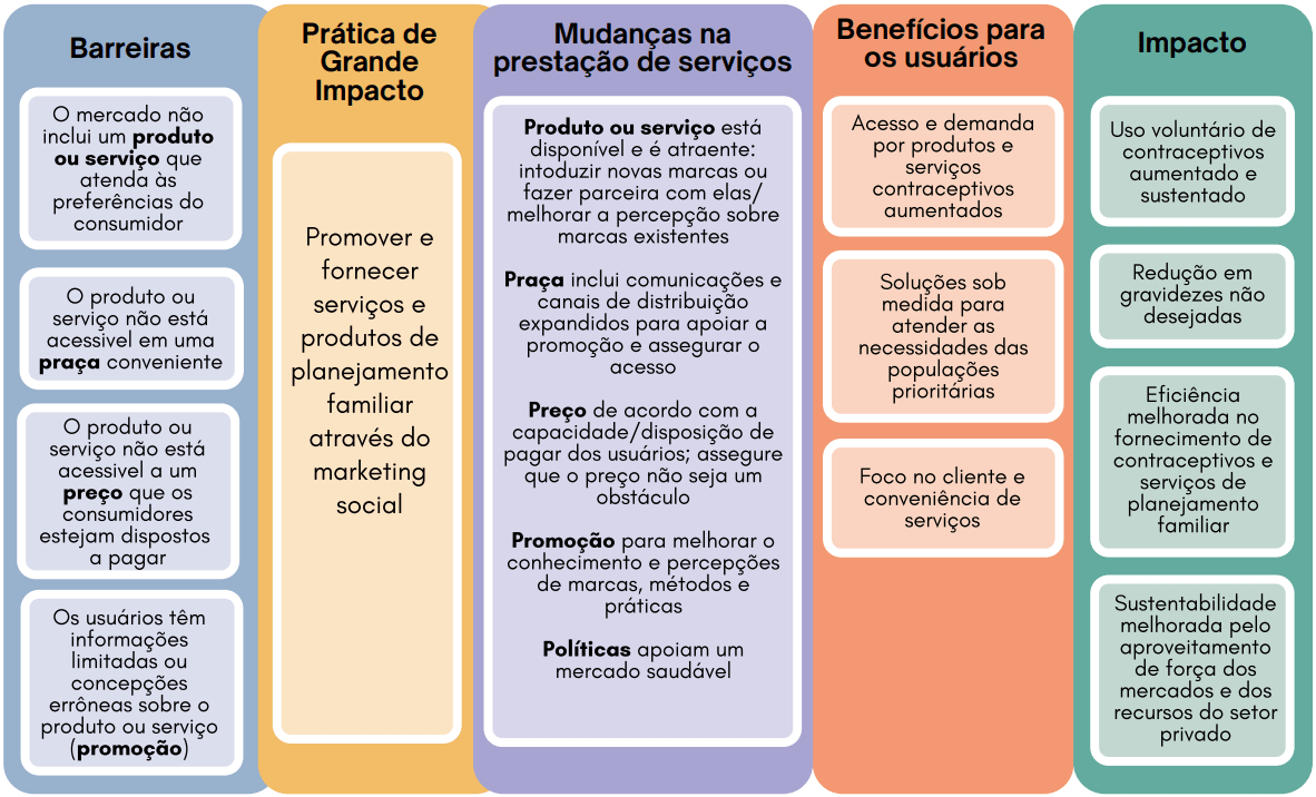 Prática de Grande Impacto em Planejamento Familiar (PGI). Marketing Social: Usar princípios e técnicas mercadológicas para melhorar o acesso, a escolha e o uso de contraceptivos. Washington, DC: Parcerias PGI; setembro 2021. Disponível em: https://staging.fphighimpactpractices.org/pt/briefs/marketing-social/