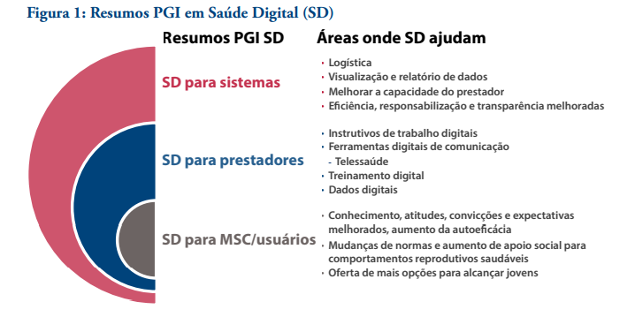 Dos seis blocos constituintes dos sistemas de saúde identificados pela OMS,3 este resumo foca no primeiro: prestação de serviços. Mais especificamente o foco está nos modos como a saúde digital pode apoiar prestadores de serviços a oferecer serviços contraceptivos de qualidade. No contexto dos modelos de sistemas de saúde de alta qualidade mais recentes, este resumo foca em dois aspectos do modelo: cuidados de saúde e sistemas competentes (elemento do processo de assistência) e recursos humanos (elemento de base)4. O foco deste resumo está especificamente em prestadores porque outros resumos de Prática de Grande Impacto (PGI) discutem tecnologias digitais para usuários e tecnologias digitais para fortalecer o sistema de saúde. A Figura 1 resume o conteúdo incluído nos três resumos PGI de saúde digital. tecnologias digitais para usuários e tecnologias digitais para fortalecer o sistema de saúde. A Figura 1 resume o conteúdo incluído nos três resumos PGI de saúde digital.