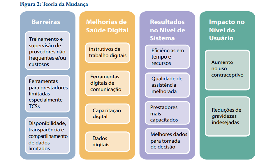 As ferramentas de saúde digital podem ajudar os prestadores de PF a entregar cuidados com mais alta qualidade através de instrutivos de trabalho, ferramentas de comunicação, treinamento e dados. A Teoria da Mudança (Figura 2) mostra resultados no nível de sistema e impactos no nível do usuário quando prestadores usam ferramentas de saúde digitais para abordar barreiras à qualidade de serviço.