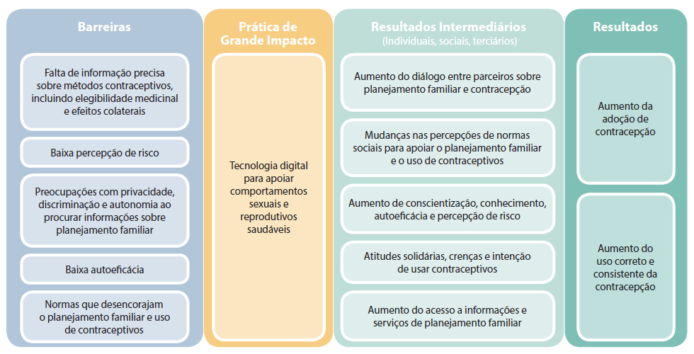 O uso de tecnologias digitais para apoiar comportamentos sexuais e reprodutivos saudáveis é uma das muitas “práticas de alto impacto em planejamento familiar” (PGIs) promissoras identificadas por um grupo técnico de consultoria formado por especialistas internacionais. Uma prática promissora tem evidência limitada, sendo necessárias mais informações para documentar completamente a experiência e o impacto de sua implementação. O grupo de consultores recomenda que essas intervenções sejam promovidas amplamente, desde que sejam implementadas dentro do contexto de pesquisas e cuidadosamente avaliadas tanto em termos de impacto quanto de processo.9 Para mais informações sobre PGIs, consulte https://staging.fphighimpactpractices.org/pt/overview.