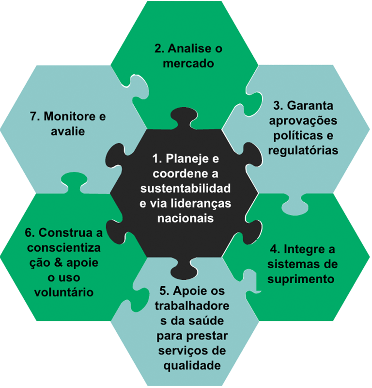 - Conecte atividades de introdução nacionais/subnacionais com esforços globais ou regionais para assegurar o trânsito de evidências entre países. A coordenação deve alinhar demandas nacionais com o abastecimento global disponível. A conformação de um mercado global7 pode ajudar a abordar barreiras enfrentadas por fabricantes.